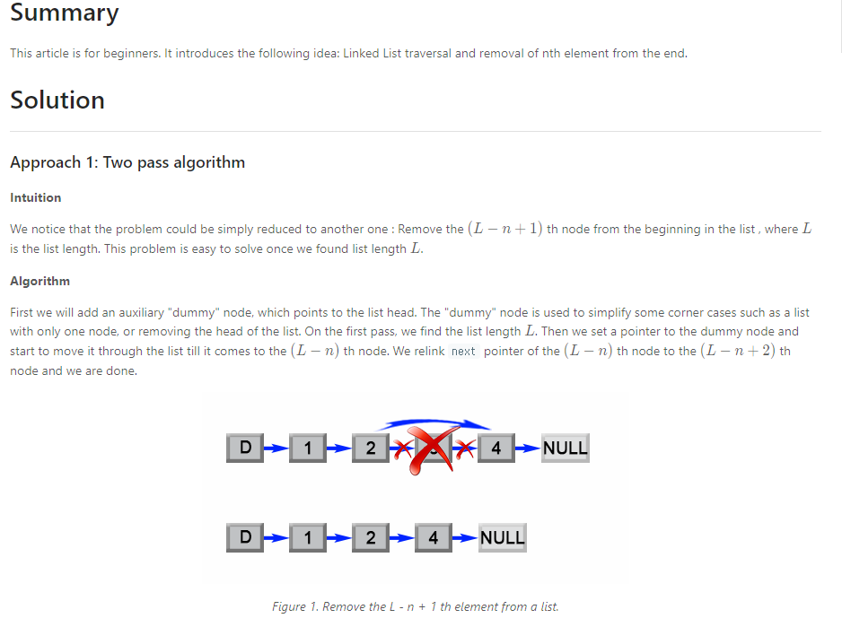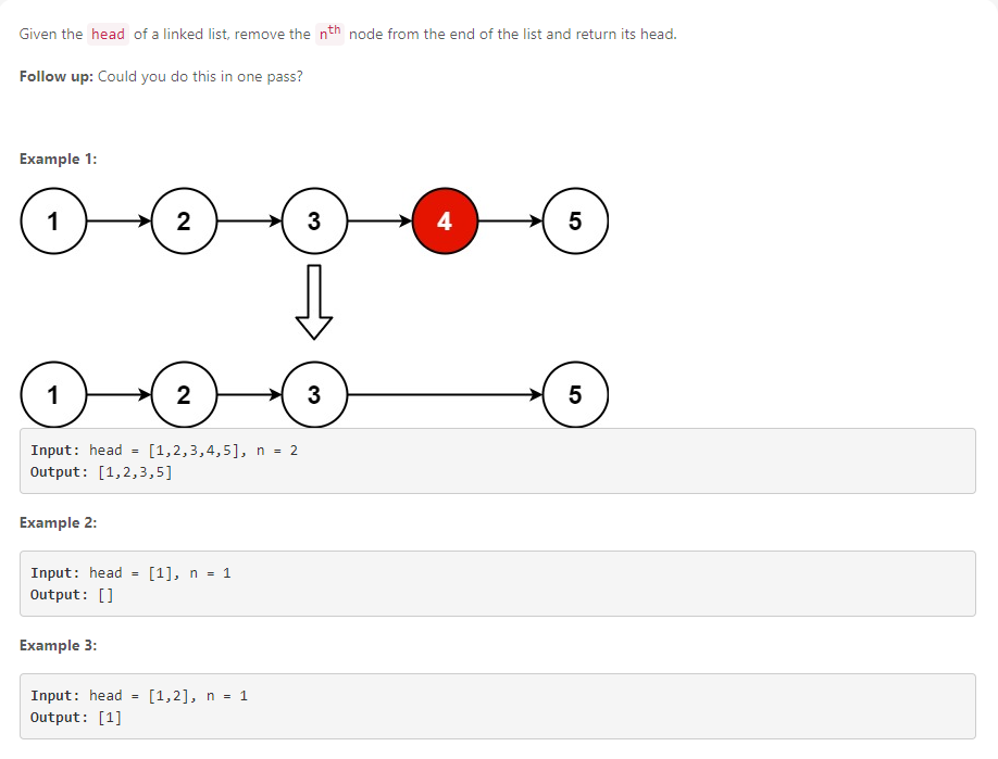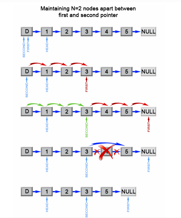 The above algorithm could be optimized to one pass. Instead of one pointer, we could use two pointers. The first pointer advances the list by n+1 steps from the beginning, while the second pointer starts from the beginning of the list. Now, both pointers are exactly separated by n nodes apart. We maintain this constant gap by advancing both pointers together until the first pointer arrives past the last node. The second pointer will be pointing at the nth node counting from the last. We relink the next pointer of the node referenced by the second pointer to point to the node's next next node.
