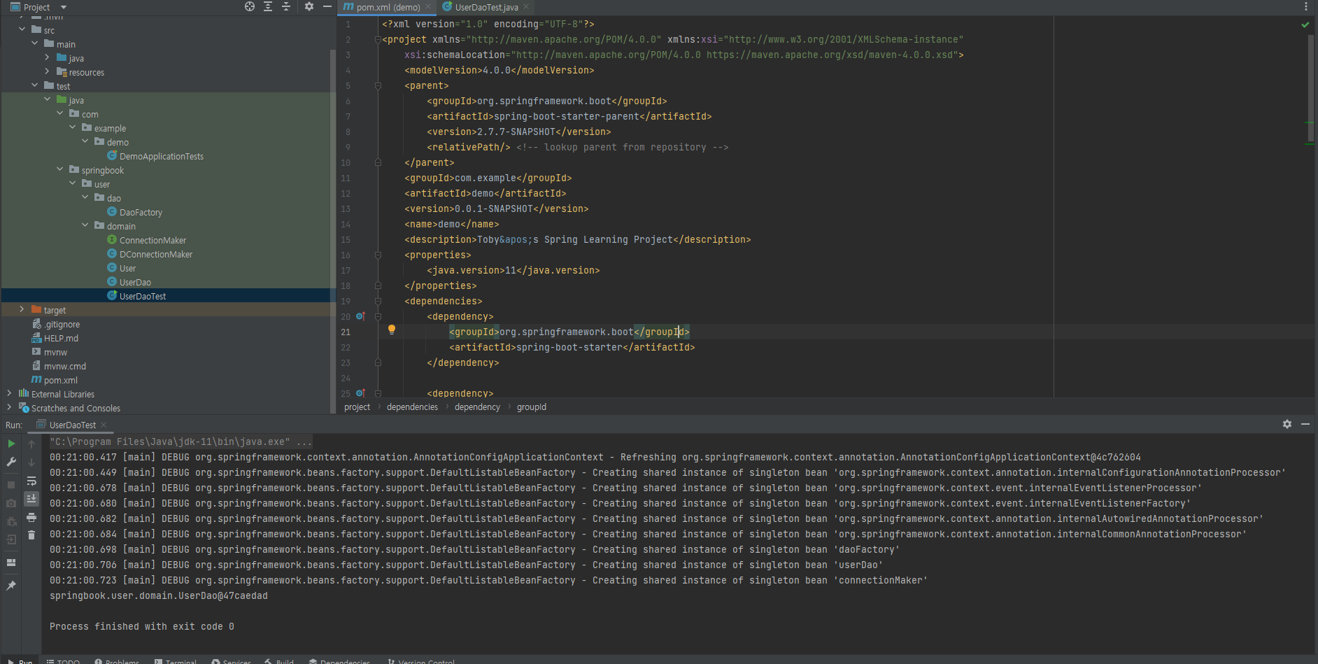 Error: Unable to initialize main class springbook.user.domain.UserDaoTest