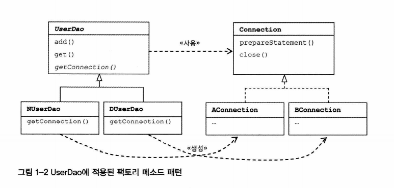 기능이 추가되거나 바뀐 것은 없지만 UserDao는 이전보다 훨씬 깔끔해졌고 미래의 변화에 좀 더 손쉽게 대응할 수 있는 코드가 됐다. 이런 작업을 리팩토링(refactoring)이라고 한다. 또한 위에서 사용한 getConnection()이라고 하는 공통의 기능을 담당하는 메소드로 중복된 코드를 뽑아내는 것을 리팩토링에서는 추출(extract method)기법이라고 부른다.