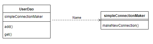어떤 ConnectionMaker 구현 클래스를 사용할지 결정하는 코드로 인해 UserDao와 DConnectionMaker에서 관계가 생성되었다.