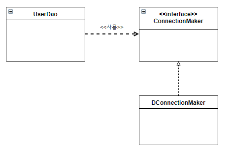 하지만 ConnectionMaker 인터페이스를 구현한 클래스, 즉 DConnectionMaker등이 다른 것으로 바뀌거나 그 내부에서 사용하는 메소드의 변화가 생겨도 UserDao에 영향을 주지 않는다. 이렇게 인터페이스에 대해서만 의존관계를 만들어두면 인터페이스 구현 클래스와의 관계는 느슨해지면서 변화에 영향을 덜 받는 상태가 된다.