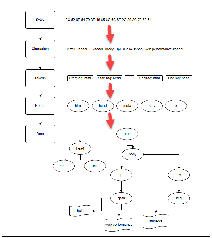 Bytes -> Chracters -> Tokens -> Nodes -> CSSOM