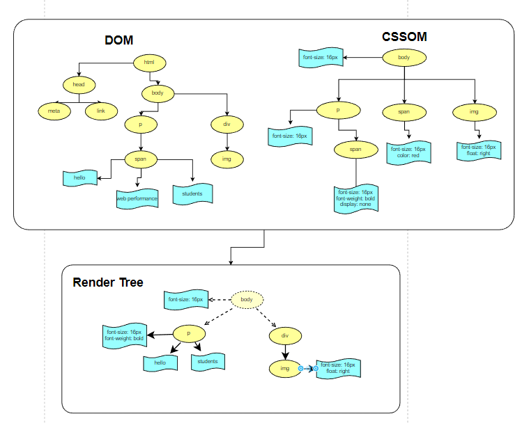 DOM트리와 CSSOM 트리를 결합하여, 표시해야 할 순서로 내용을 그려낼 수 있게 렌더 트리(Render Tree)를 형성한다.