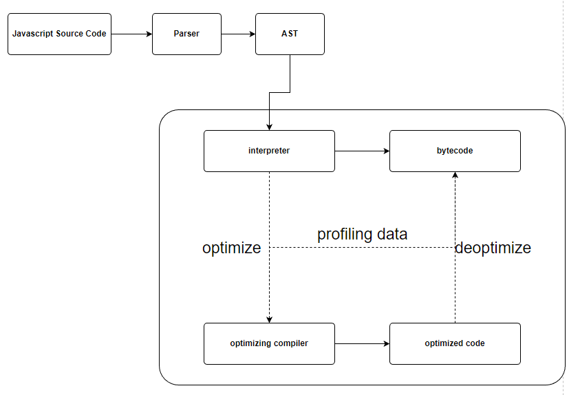 - 인터프리터가 바이트코드를 실행시, 자주 사용하는 함수 및 타입 정보등이 있는 프로파일링 데이터(Profiling data)와 같이 최적화 컴파일러 (Optimizing compiler)에게 보낸다.