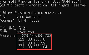 cmd에서 'nslookup 도메인주소' 를 입력하면 해당 도메인 주소의 IP가 나온다.