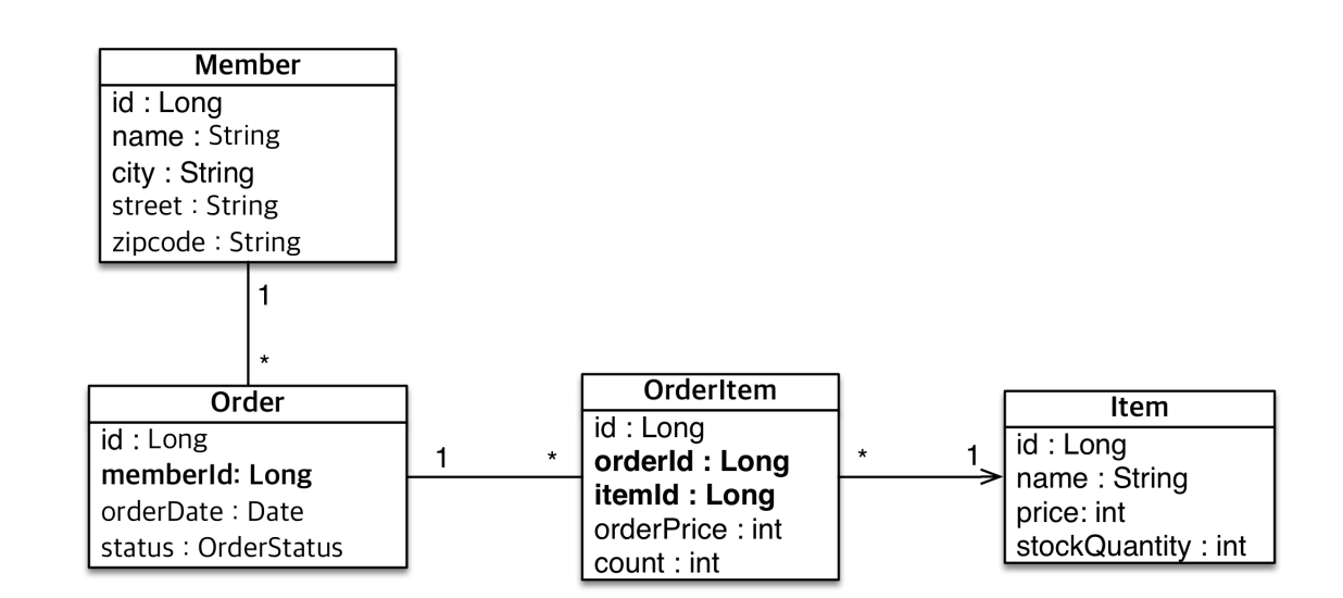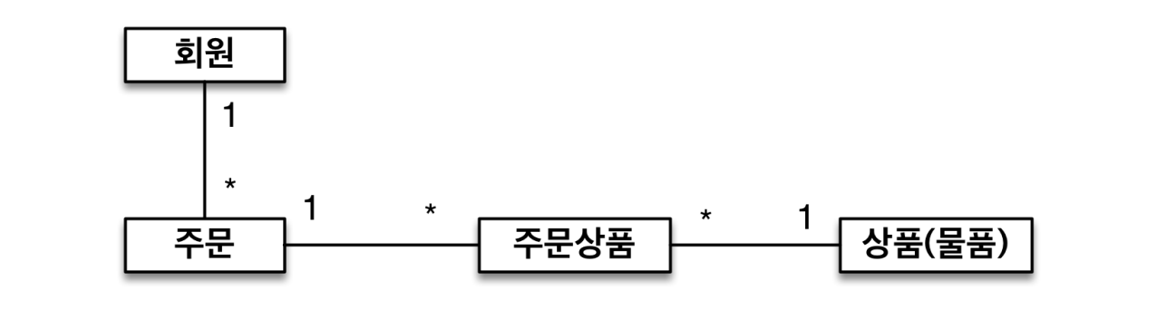 - 주문과 상품의 관계: 주문할 때 여러 상품을 선택할 수 있다. 반대로 같은 상품도 여러 번 주문될 수 있다. 주문상품이라는 모델을 만들어서 다대다 관계를 일다대, 다대일 관계로 풀어냄