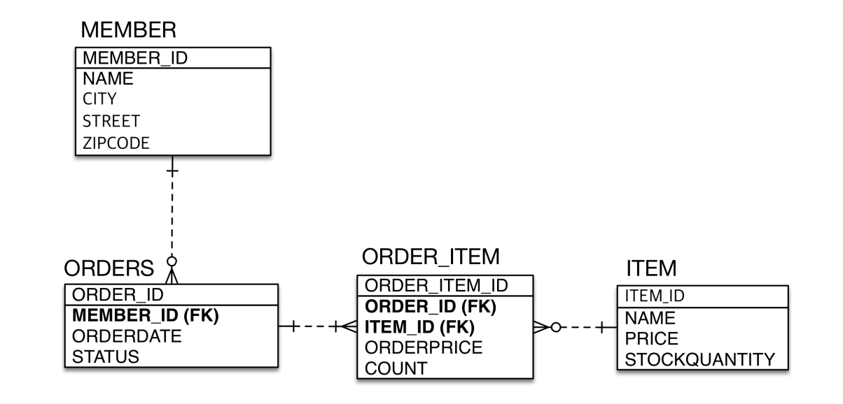 - 회원과 주문의 관계: 회원은 여러 번 주문할 수 있다. (일대다)