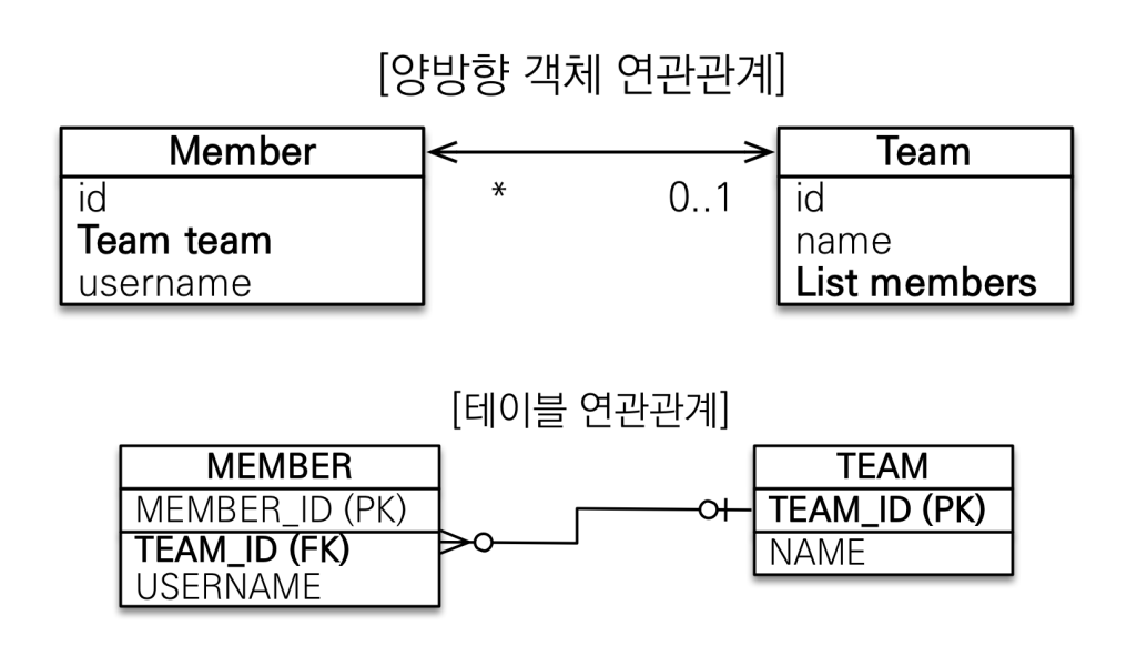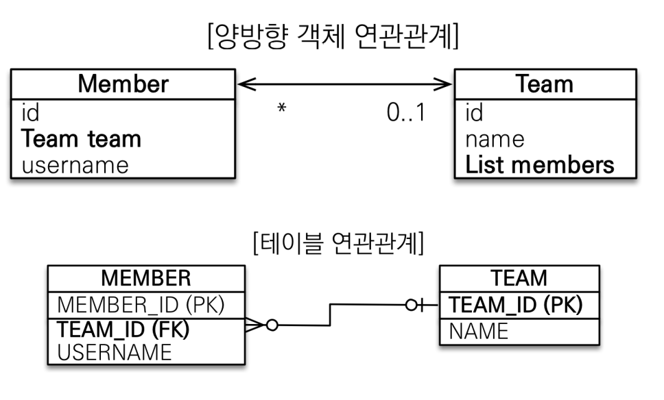 객체의 양방향 관계는 사실 양방향 관계가 아니라 서로 다른 단방향 관계 2개다.