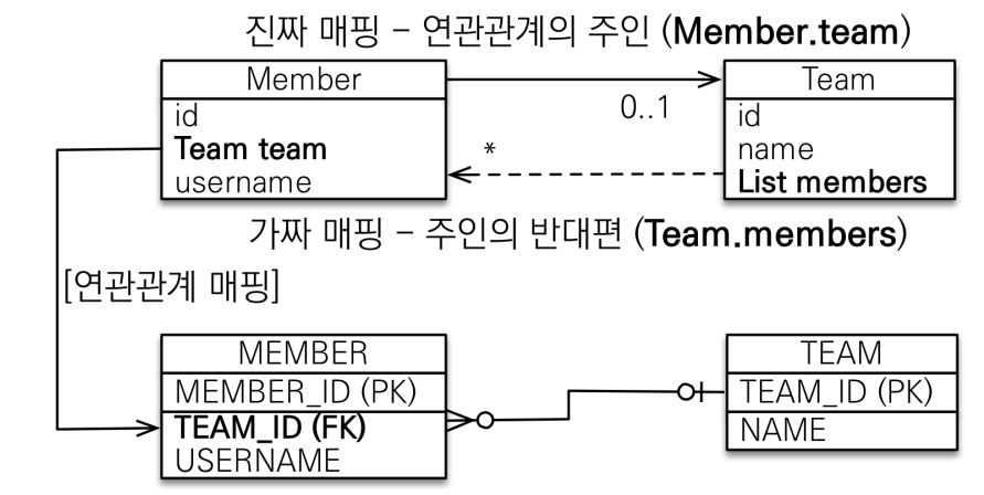 MEMBER.TEAM_ID 외래 키 하나로 양방향 연관관계 가짐 (양쪽으로 조인할 수 있다.)