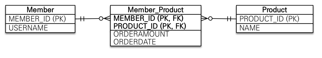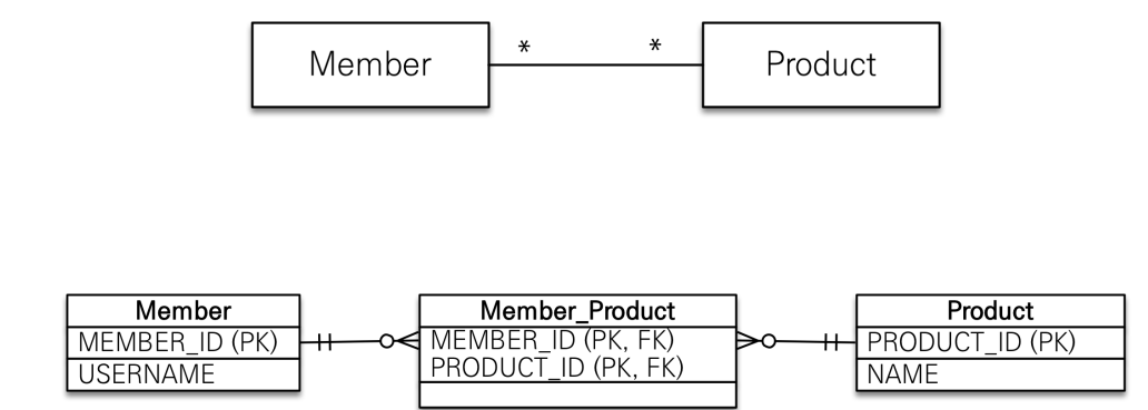 - 관계형 데이터베이스는 정규화된 테이블 2개로 다대다 관계를 표현할 수 없음