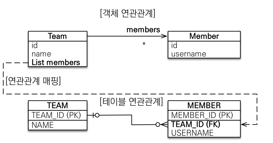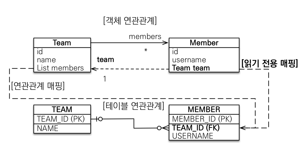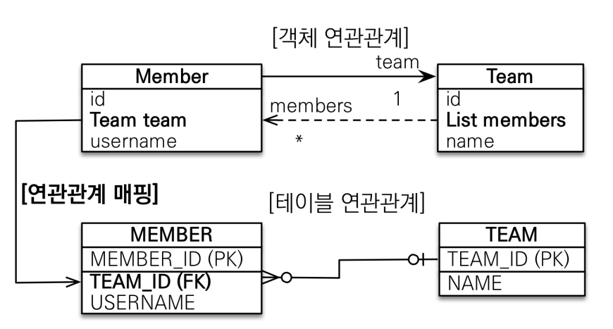 - 객체와 테이블의 차이 때문에 반대편 테이블의 외래 키를 관리하는 특이한 구조