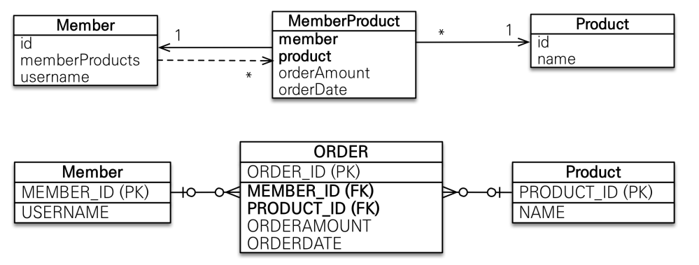 - 객체는 컬렉션을 사용해서 객체 2개로 다대다 관계 가능