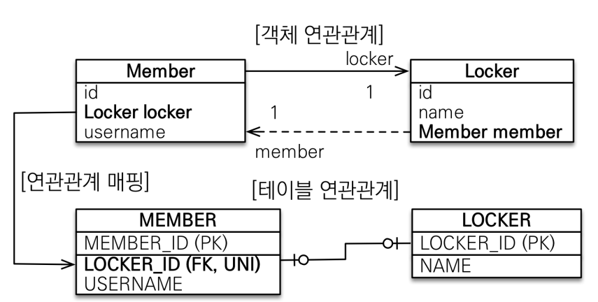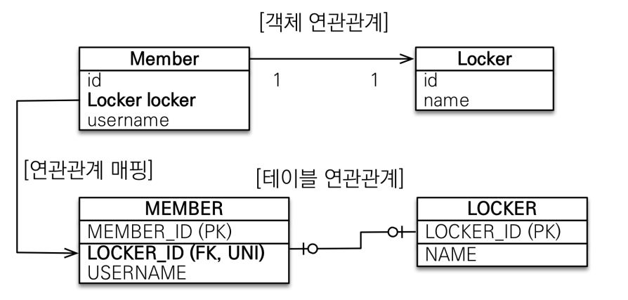 - 테이블은 외래 키 하나로 두 테이블이 연관관계를 맺음