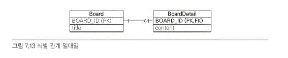 - 식별 관계는 2개 이상의 컬럼을 합해서 복합 기본 키를 만들어야 하는 경우가 많다.