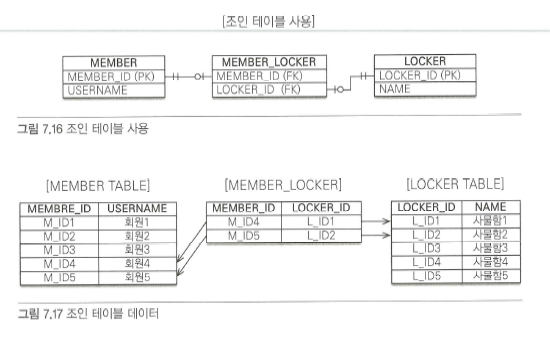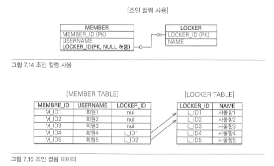 외래 키에 null을 허용하는 선택적 비식별 관계는 회원과 사물함을 조인할 때 외부 조인(OUTER JOIN)을 사용해야 한다. 실수로 내부 조인을 사용하면 사물함과 관계가 없는 회원은 조회되지 않는다. 그리고 회원과 사물함이 아주 가끔 관계를 맺는다면 외래 키 값 대부분이 null로 저장되는 단점이 있다.