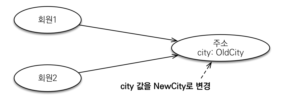 - 임베디드 타입 같은 값 타입을 여러 엔티티에서 공유하면 위험함