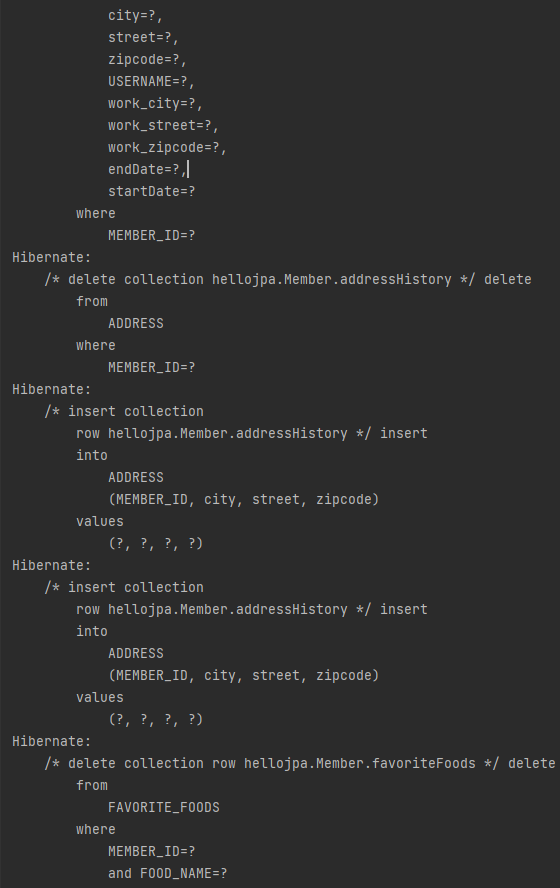 - 값 타입 컬렉션에 변경 사항이 발생하면, 주인 엔티티와 연관된 모든 데이터를 삭제하고, 값 타입 컬렉션에 있는 현재 값을 모두 다시 저장한다.