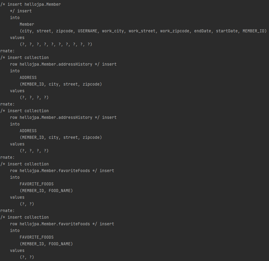 - 값 타입 컬렉션을 매핑하는 테이블은 모든 컬럼을 묶어서 기본키를 구성해야 함: null 입력X, 중복 저장X