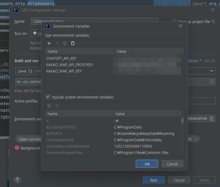 2. Edit Configuration Settings에서 Envrioment Variables 설정