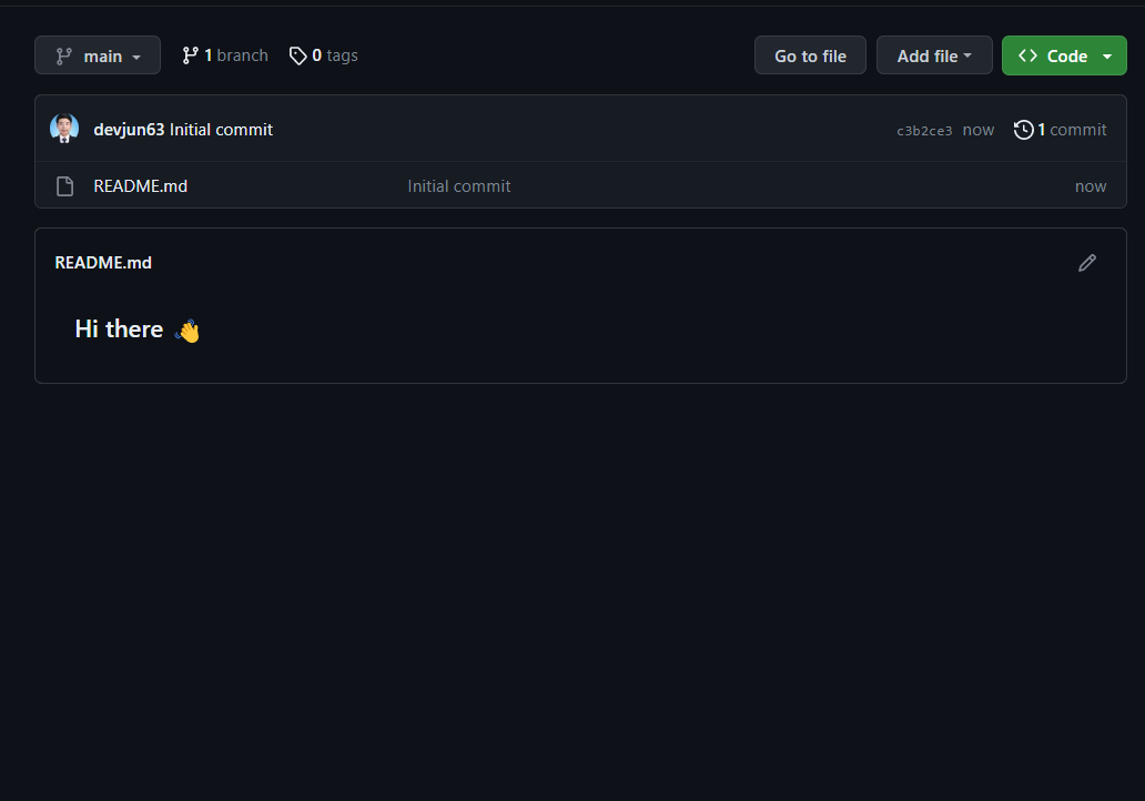 옵션 체크 후 create repository를 누르면 다음과 같이 readme.md 파일이 생성된 페이지가 나옵니다.