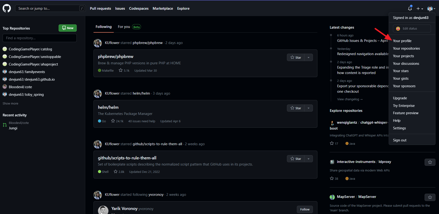 깃허브에 로그인 하고 profile로 들어가 봅시다.