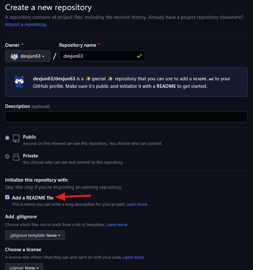 Create a new repository 후 Repo 이름을 자신의 닉네임으로 설정합니다.
