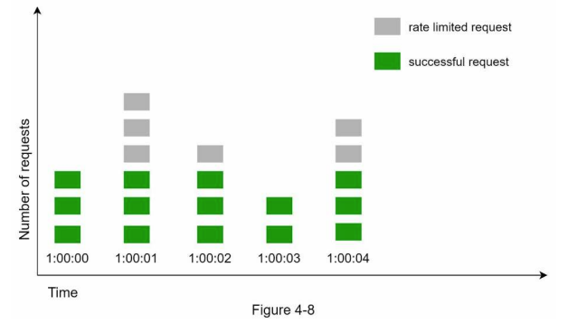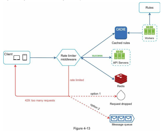 - 처리율 제한 미들웨어는 제한 규칙을 캐시에서 가져온다. 아울러 카운터 및 마지막 요청의 타임스탬프(timestamp)를 레디스 캐시에서 가져온다. 가져온 값들에 근거하여 해당 미들웨어는 다음과 같은 결정을 내린다
