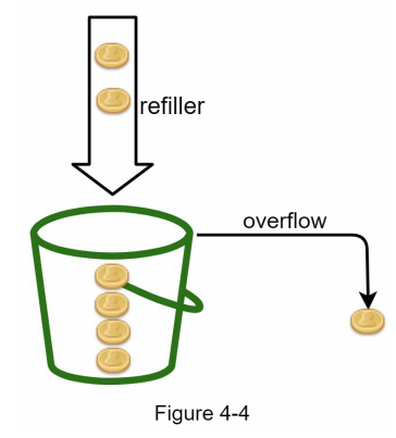 - 토큰 버킷은 지정된 용량을 갖는 컨테이너다. 이 버킷에는 사전 설정된 양의 토큰이 주기적으로 채워진다. 토큰이 꽉 찬 버킷에는 더 이상의 토큰은 추가되지 않는다. 아래 그림은 용량이 4인 버킷이다. 토큰 공급기(refiller)는 이 버킷에 매초 2개의 토큰을 추가한다. 버킷이 가득 차면 추가로 공급된 토큰은 버려진다.(overflow)