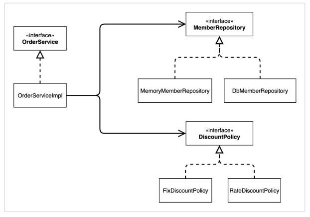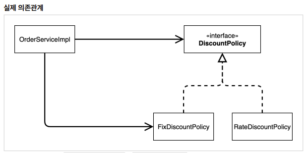 - FixDiscountPolicy와 RateDiscountPolicy라는 구체(구현) 클래스에 의존