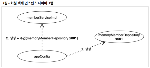 - AppConfig는 생성한 객체 인스턴스의 참조(레퍼런스)를 생성자를 통해서 주입(연결)해준다.
