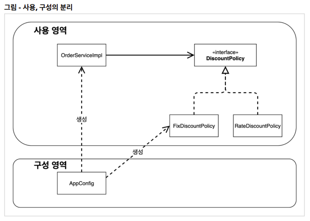 - 애플리케이션의 전체 동작 방식을 구성(config)하기 위해, 구현 객체를 생성하고, 연결하는 책임을 가지는 별도의 설정 클래스
