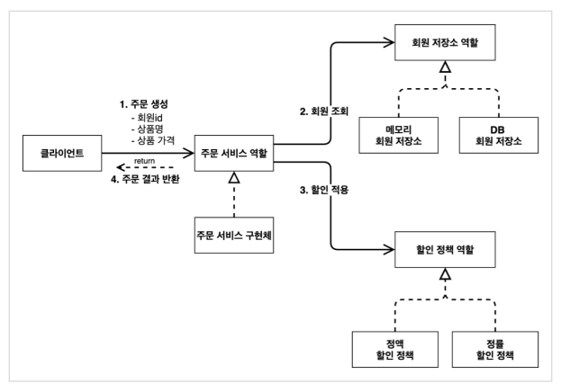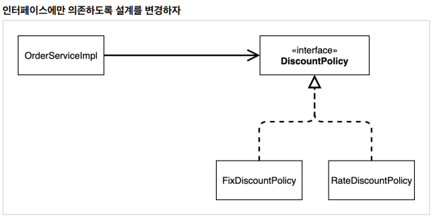 - 클라이언트 코드가 DiscountPolicy 추상화 인터페이스에만 의존하도록 코드를 변경했다.