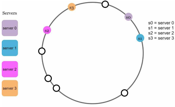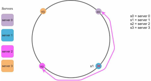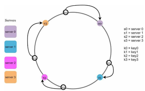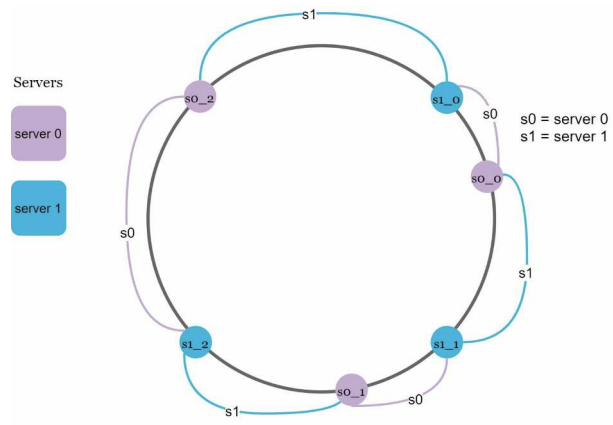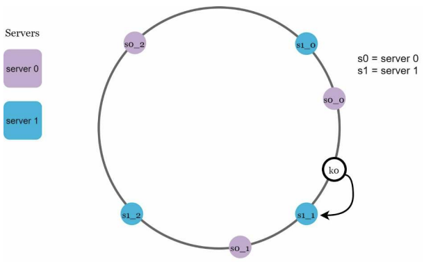 k0가 저장되는 서버는 k0의 위치로부터 링을 시계방향으로 탐색하다 만나는 최초의 가상 노드 s1_1 즉 서버 1이다.