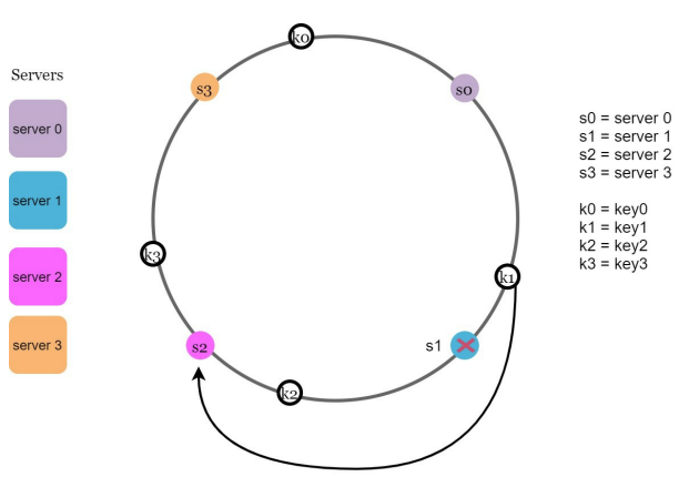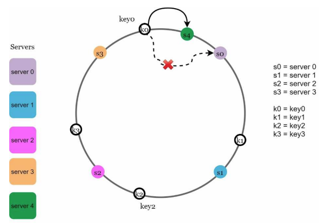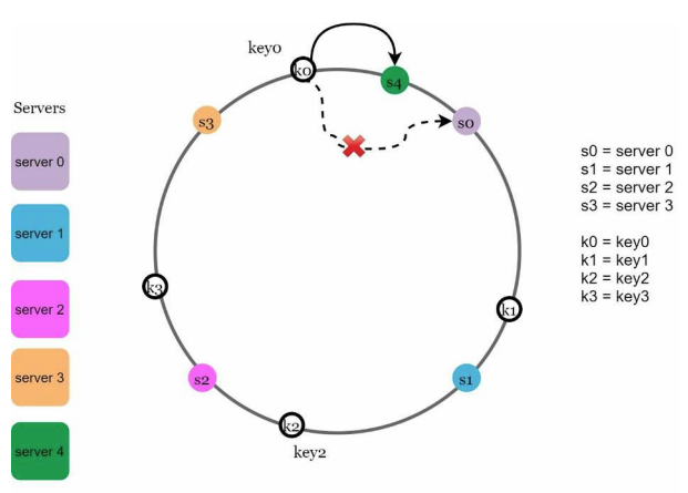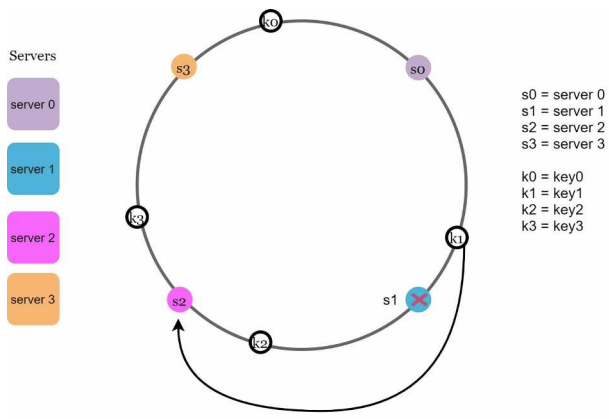- 하나의 서버가 제거되면 키 가운데 일부만 재배치된다. / 서버 1이 삭제되었을 때 key1만이 서버 2로 재배치 됨