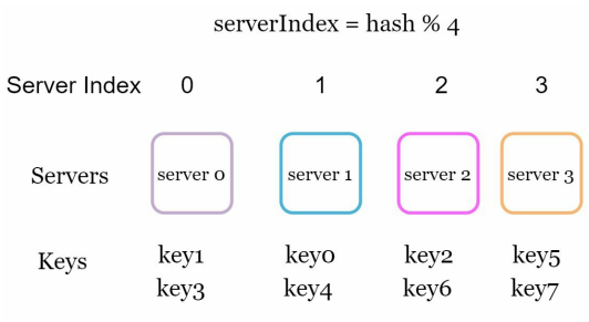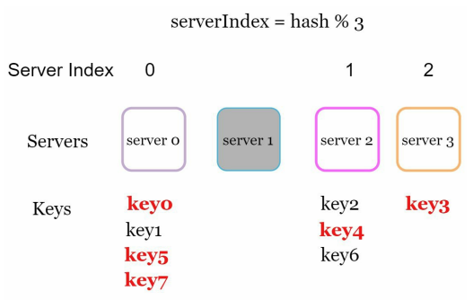 serverIndex = hash(key) % N (N은 서버의 개수이다.)