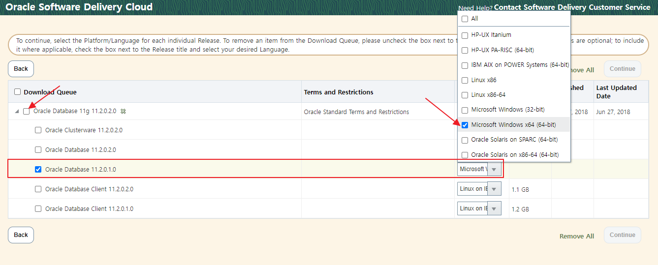 1) DLP: Oracle Database 11g 11.2.0.2.0 ( Oracle Database Enterprise Edition ) 클릭 및 View Items 클릭 -> Continue