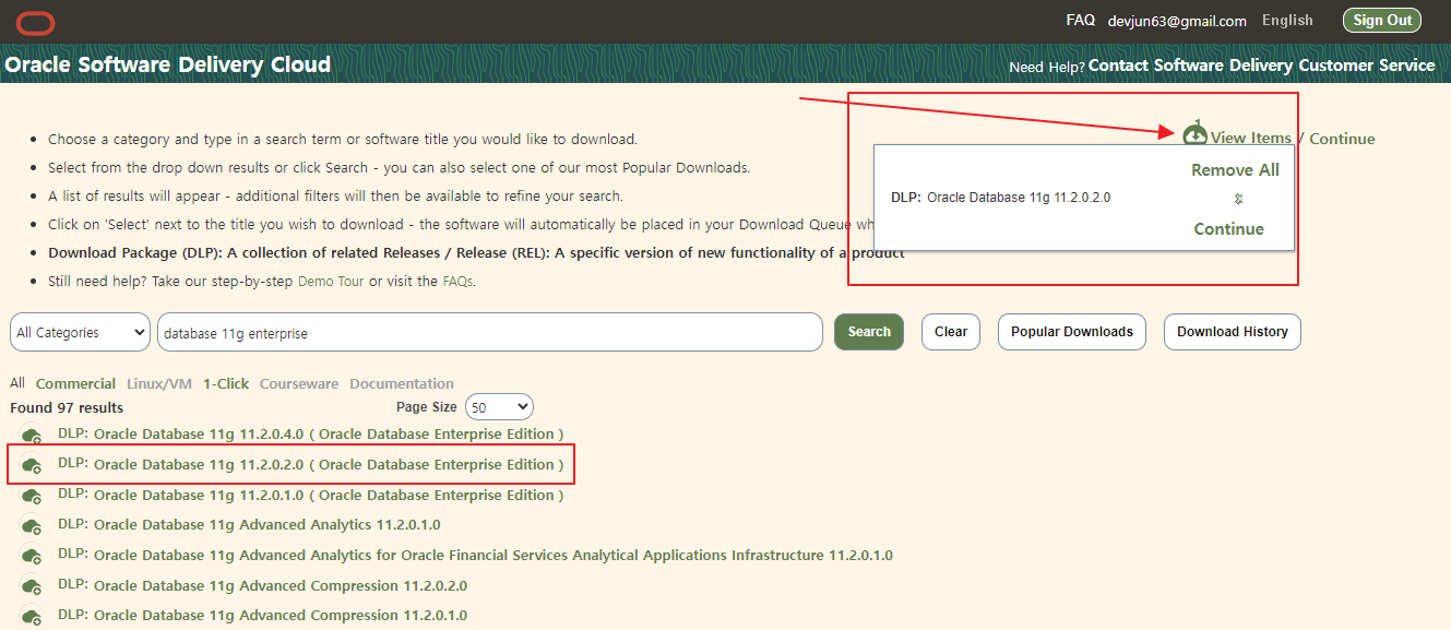 1) DLP: Oracle Database 11g 11.2.0.2.0 ( Oracle Database Enterprise Edition ) 클릭 및 View Items 클릭 -> Continue