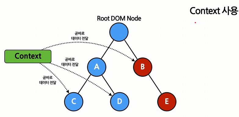 // 컨텍스트는 데이터를 매번 컴포넌트를 통해 전달할 필요 없이 컴포넌트 트리로 곧바로 전달하게 해줍니다.