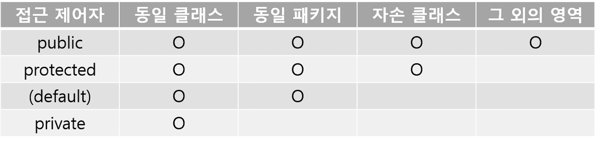 - 접근 제어자 - 접근 제어자는 해당 클래스 또는 멤버를 정해진 범위에서만 접근할 수 있도록 통제하는 역할을 한다. 클래스는 public과 default밖에 쓸 수 없다. 범위는 다음과 같다. 참고로 default는 아무것도 덧붙이지 않았을 때를 의미한다.