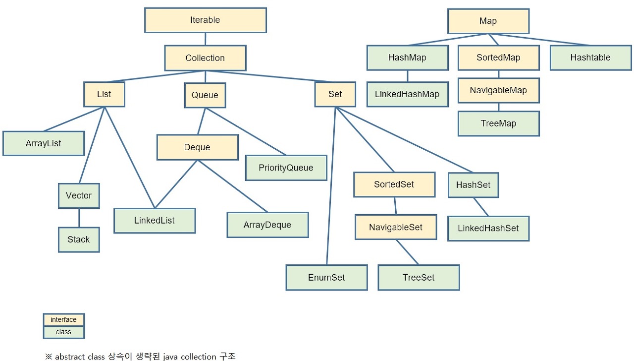 - Collection 이란? Collection은 자료구조 List, Set 의 구현 객체이다(Interface). 하지만 Map 같은경우 List, Set과 달리 Key-Value 라는 구조적인 차이가 있어 Collection Interface를 구현(상속)하지 안고..