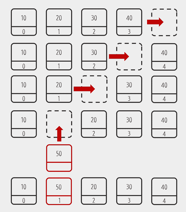 index가 1, value가 50인 element를 추가할 시 다음과 같이 값이 밀려나는 과정이 필요하다.