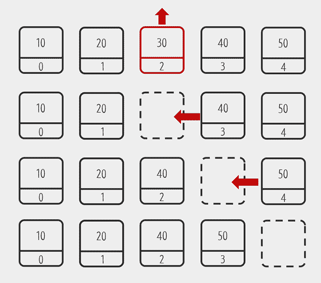 index가 2, value가 30인 element를 삭제할 시 다음과 같이 값을 땡기는 과정이 필요하다.