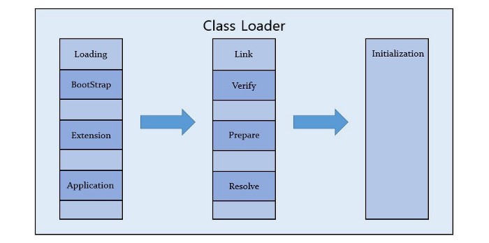 - 링크 : Verify, Prepare, Resolve 세 단계로 나누어져 있습니다. 검증(verify) 은 .class 파일 형식이 유효한지 체크합니다. Preparation 은 클래스 변수와 기본값에 필요한 메모리, Resolve 는 심볼릭 메모리 래퍼런스를 메서드 영역에 있는 실제 레퍼런스로 교체합니다.